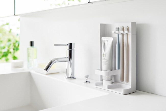 歯ブラシや歯磨き粉をすっきり収納できるスリムスタンド。