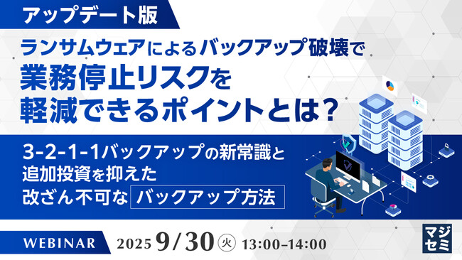 マジセミ株式会社は「【アップデート版】ランサムウェアによるバックアップ破壊で業務停止リスクを軽減できるポイントとは?」というテーマのウェビナーを開催します。