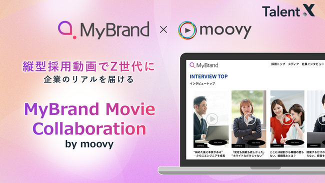 株式会社TalentX(本社:東京都新宿区、代表取締役社長CEO:鈴木 貴史、証券コード:330A、以下「TalentX」)は、採用動画の制作および配信サービスを運営する株式会社moovy(本社:東京都渋谷区、代表取締役:三嶋 弘哉、以下「moovy」)と提携し、新サービス「MyBrand movie collaboration by moovy」をリリースいたします。