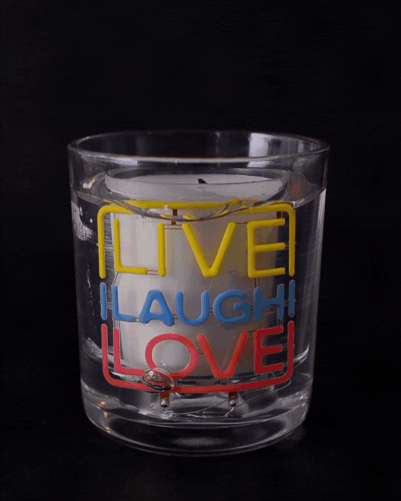 キャンドル芯に火を灯すと、光センサーが炎を感知し、ガラス表面に配置されたメッセージが鮮やかに発光します。