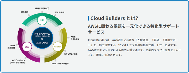 クラウドビルダーズ株式会社(本社:東京都港区赤坂、代表取締役:池西耕平)は本日、企業のAWS導入における「人材調達」「開発」「運用」をワンストップで支援する「AWS特化型ワンストップ・クラウド導入支援」の提供を開始し、その詳細を紹介する専用Webページを公開しました。