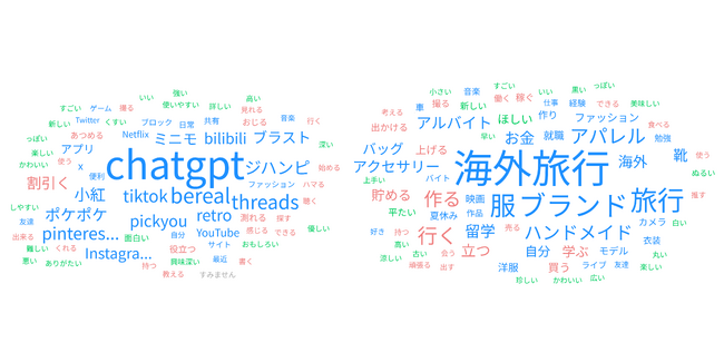 - おもしろい・新しいと思うサービスやアプリ圧倒的に「ChatGPT」。「SNSなどの共有サービス」「創作支援ツール」「海外のSNS・ファッションフリマ」「生活改善・時短サービス」にも着目。