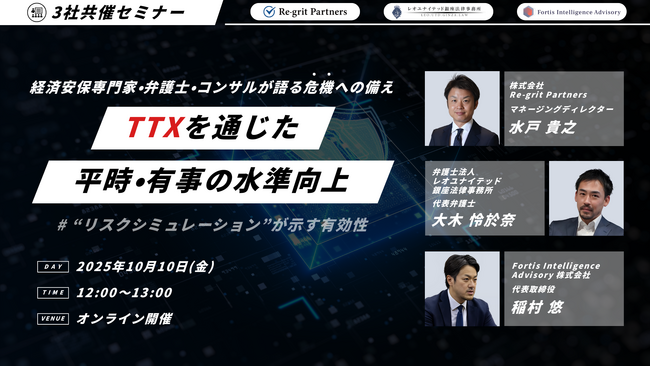 株式会社Re-grit Partners(本社:東京都千代田区、代表取締役社長:山木 智史、以下「当社」)はFortis Intelligence Advisory株式会社・弁護士法人レオユナイテッド銀座法律事務所と、2025年10月10日(金)に「経済安保専門家・弁護士・コンサルタントが語る危機への備えーTTXを通じた平時・有事の水準向上」を共催することをお知らせいたします。本ウェビナーでは、当社所属の水戸 貴之が、Fortis Intelligence Advisory株式会社の稲村 悠氏、弁護士法人レオユナイテッド銀座法律事務所の大木 怜於奈氏とともにTTX(テーブルトップエクササイズ)を活用した危機対応力を高める実践的アプローチを解説します。企業の危機対応力強化に関心のある皆さまに最適な、理論と実務の双方から学べるプログラムとなっていますので、ぜひご参加ください。