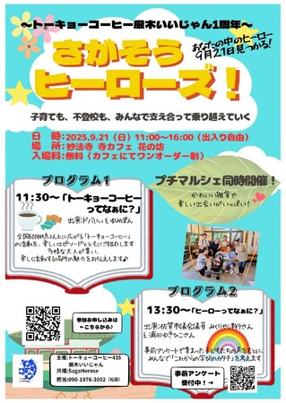 不登校支援コミュニティ「トーキョーコーヒー厳木いいじゃん!」(佐賀県唐津市)は、1周年を記念し、任意団体「佐賀ヒーローズ」と協賛して、市民参加型イベント「さがそうヒーローズ!」を2025年9月21日(日)に開催します。後援:佐賀新聞・グローバルバイト合同会社。