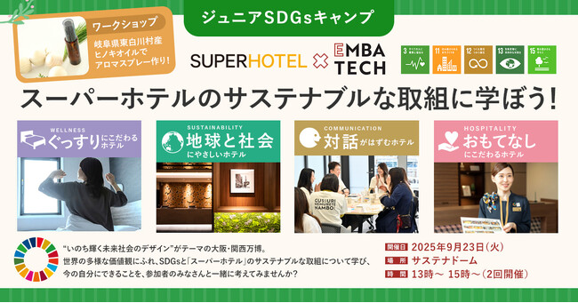 「Natural, Organic, Smart」をコンセプトに国内外177店舗のホテル運営を手掛ける株式会社スーパーホテル(所在地:大阪府大阪市、代表取締役社長:山本健策)は、2025年9月23日(火・祝)、2025年日本国際博覧会(大阪・関西万博)にて教育テック大学院大学が提供する体験型SDGs学習プログラム「ジュニアSDGsキャンプ」に参画し、ワークショップを開催いたします。
