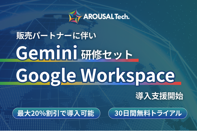 AI研修・コンサルティング・開発支援を行うアローサル・テクノロジー株式会社(本社:東京都港区、代表取締役:佐藤拓哉)は、Google Workspace販売パートナー契約を締結いたしました。当社を通じて「Google Workspace」を契約・導入いただく企業は、最大20%割引で導入でき、コストを抑えつつ最新の業務基盤を整備できます。さらに、新規導入をご検討の企業向けに、30日間無料でご利用いただけるトライアルキャンペーンも実施しています。