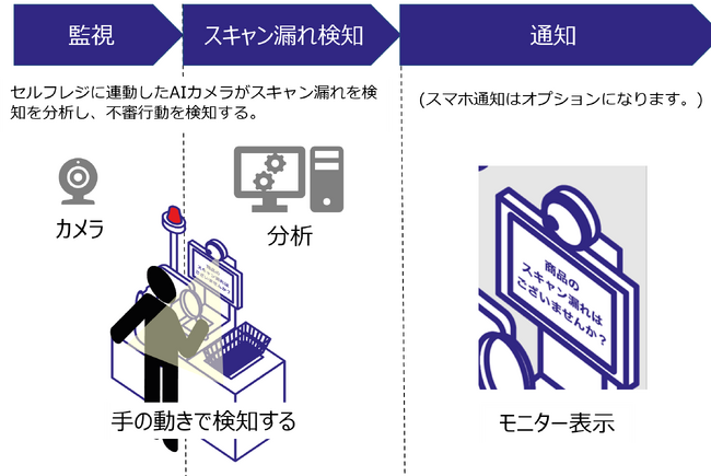 〇概要:セルフレジにおける未精算商品のスキャンミスを検知し、通知することによって売上ロスを低減させる技術