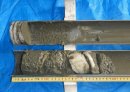今回の海洋調査では、ガスチムニーやマウンドの分布を手掛かりに、鳥取県の沖合約145km、隠岐諸島の東北沖約60km、水深約700mの海底に、調査船上から全長6mのピストンコアラー 注3) を投入し、メタンハイドレートを含む海底堆積物を採取しました(写真1)。海底からは、分解したメタンがもとになってできる炭酸塩も大量に回収されました。