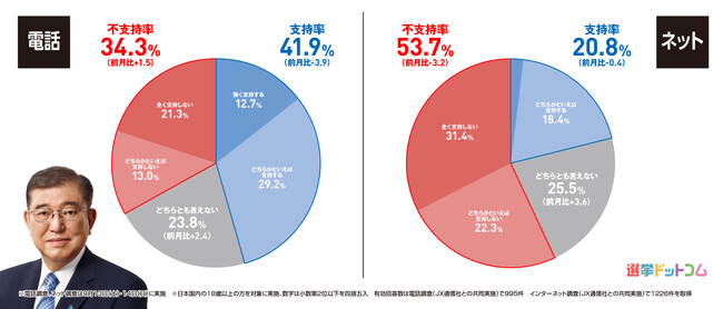 石破総理の辞任表明後の調査となりましたが、電話・ネット調査ともに支持率が下がり、「どちらとも言えない」が2~3ポイント増える結果となりました。一方、不支持率は電話調査で上がりましたが、ネット調査では下がりました。