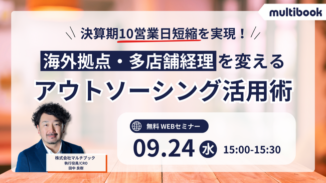 グローバルクラウドERPサービス「multibook(マルチブック)」を提供する株式会社マルチブック(東京都品川区、代表取締役社長:渡部 学)は、Webセミナー「決算期10営業日短縮を実現!海外拠点・多店舗経理を変えるアウトソーシング活用術」を開催いたします。