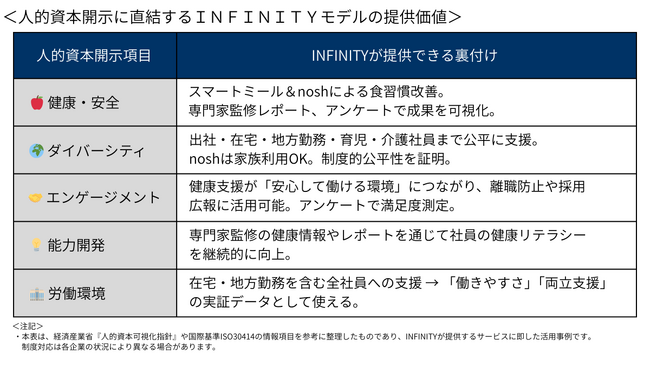 INFINITYは、制度対応を重視する大企業・自治体に向けて、「食支援×人的資本開示」標準モデルを