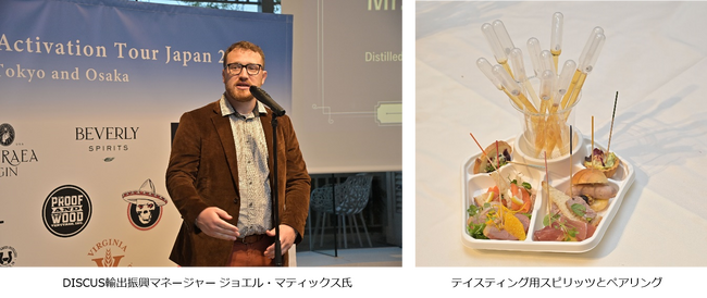 当日はまず、DISCUS輸出振興マネージャー ジョエル・マティックス氏が登壇し、アメリカンスピリッツに関心を寄せる日本のメディア関係者への感謝を述べました。続いて、本イベントが両国の蒸留酒文化を共有する場となることへの期待を込めて乾杯が行われ、和やかな雰囲気の中で幕を開けました。