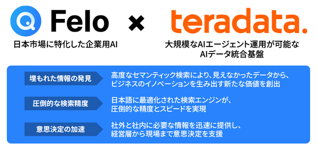 日本企業の競争力強化を牽引するAIスタートアップ、Felo株式会社(本社:東京都千代田区 以下Felo)は、Teradata Corporationの日本法人、日本テラデータ株式会社(本社:東京都港区、代表取締役社長:大澤 毅、以下、Teradata)と、日本企業のAIドリブン経営を実現するための戦略的パートナーシップを締結しました。これにより、AI検索ソリューション「Felo Enterprise」とハイブリッドクラウドAIデータプラットフォーム「Teradata Vantage」の連携が実現しました。企業に散在しサイロ化したデータをTeradata Vantageで論理的に一元化し、Felo Enterpriseが提供する高度なAIにより、そのデータを検索、分析し、最大限活用することが可能となります。これにより、両社で日本企業のデジタルトランスフォーメーション(DX)を加速させ、AIドリブン経営の実現を強力に支援してまいります。