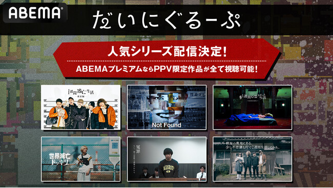 さらに、だいにぐるーぷ公式サイトでPPV配信されていた8作品を一挙配信。ABEMAプレミアムなら全て視聴可能です。無料配信作品『Not Found』に関連する『Not Found -制作の記録-』や、『1週間逃亡生活-東京編-』の特別編『1週間逃亡生活 -逃亡者編-』、そして『賞金を手にした男に密着』など、制作の舞台裏や続編にあたる特別コンテンツをご覧いただけます。ぜひ併せてお楽しみください。