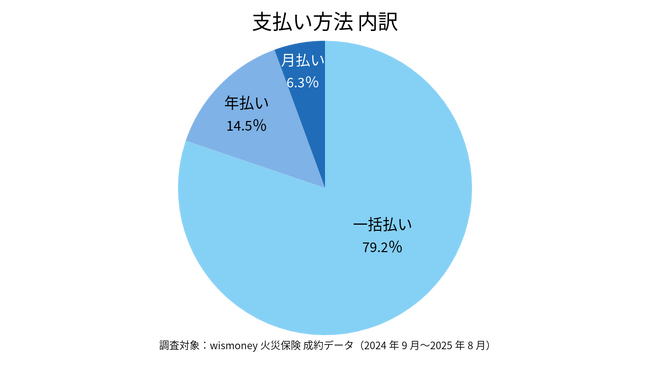 支払い方法の内訳は、一括払いが79.2%、年払いが14.5%、月払いが6.3%でした。火災保険においては「まとめて支払う」傾向が圧倒的に強いことが明らかになっています。