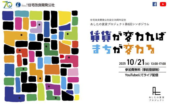 住宅改良開発公社は、10月21日(火)13時より、公社設立70周年記念「あしたの賃貸プロジェクト第6回シンポジウム」を開催します。YouTubeによるオンライン開催。参加費無料(要登録)。
