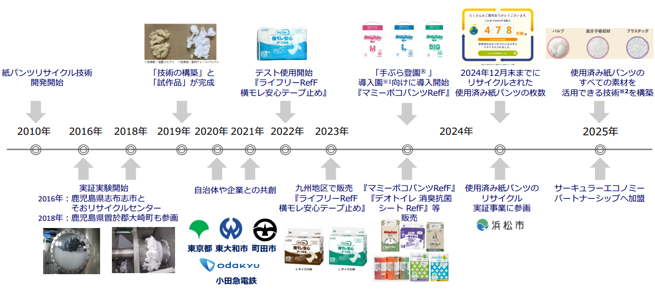 今回の受賞は、当社が推進する使用済み紙パンツ(紙おむつ)の水平リサイクル「RefF(リーフ)」が高く評価されたことによるものです。「RefF(リーフ)」は、世界で初めて使用済み紙パンツを資源として再生利用することを実用化したプロジェクトであり、従来は廃棄処理しか選択肢のなかった製品に新たな循環の道を拓いた点が特に評価されました。また、世界初の最先端のオゾン処理技術による安全性・衛生性の確保に加え、鹿児島県志布志市および大崎町と協働して地域全体で資源循環の仕組みを構築した点は、持続可能な社会の次世代モデルとして注目されました。再生された素材をベビー用品・介護用品・ペット用品といった多様な商品領域に展開し、循環型社会の実現を生活者視点で具体化していることも、受賞の決め手となりました。