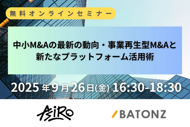 株式会社アシロ(本社所在地:東京都新宿区、代表取締役社長:中山博登、東証グロース市場 証券コード:7378)は、日本最大級のM&Aプラットフォーム『BATONZ』を運営する株式会社バトンズ(本社:東京都中央区、代表取締役CEO:神瀬 悠一、以下バトンズ)との共催で、特別セミナー「中小M&Aの最新の動向・事業再生型M&Aと新たなプラットフォーム活用術」を2025年9月26日(金)に開催することをお知らせします。