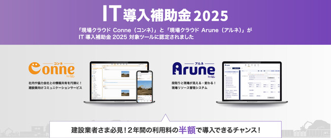 2025年 IT導入補助金の対象ツールとして、建設業向けコミュニケーションサービス「現場クラウドConne(コンネ)」と、現場リソース管理システム「現場クラウドArune(アルネ)」が認定!