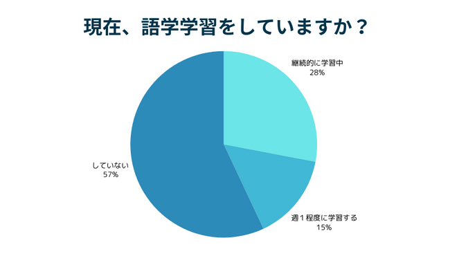 全体のうち約 28% が「継続的に学習中」、15% が「断続的に学習中」。合わせて 43% が何らかの語学学習をしている。若年層(10~20代)では、継続的+断続的で 55-60%。中高年層では30~40%程度。