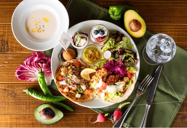 主役の2種のタコスが彩り豊かな一皿を演出します。プルドポークタコスと、mmc名物のバターミルクフライドチキンタコス、じゃがいものスープ、淡路島森農園のミックスリーフを使用したファーマーズサラダ、ひよこ豆のファラフェル、丹波産黒豆と黒ゴマのフムス、ワカモレディップ、丹波産地鶏と丹波しめじのサラダマリネ、エンゼルカップケーキ ミックスベリーソースなど、多彩なメニューをご用意しております。