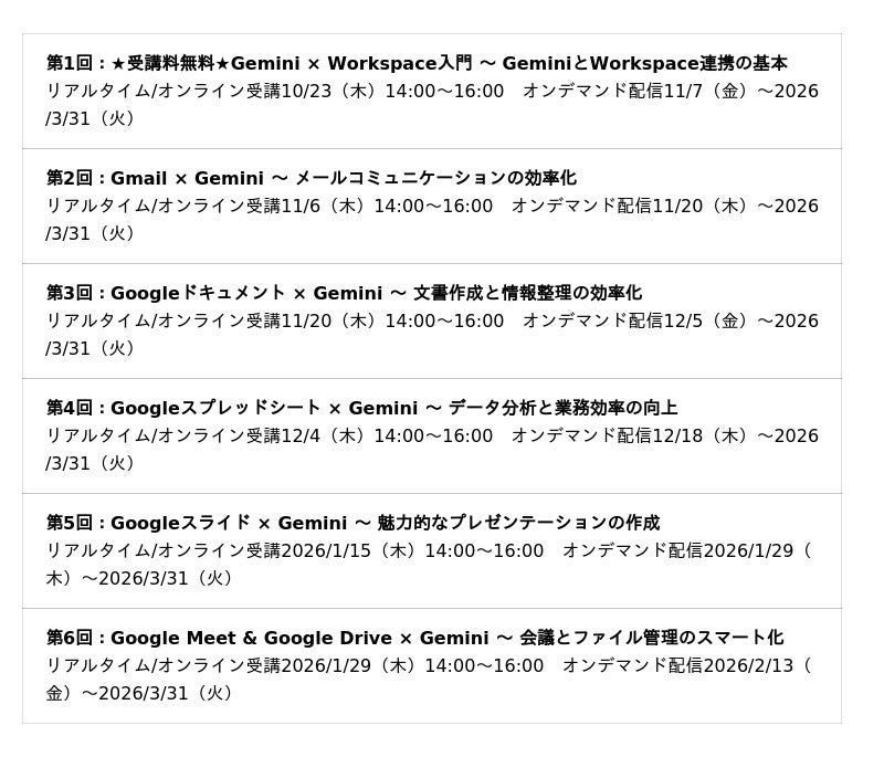 第1回では、Geminiの基本的な使い方とGoogle Workspace連携の全体像を解説し、第2回以降では各ツールに特化した具体的な活用術をくわしく解説。全6回にわたる本講座は、実際の業務に合わせて1講座からの受講が可能。日々のメール作成や資料作成などの事務作業に追われ、本来注力したい業務に時間を割けていないと感じている方にはぴったりの講座です。