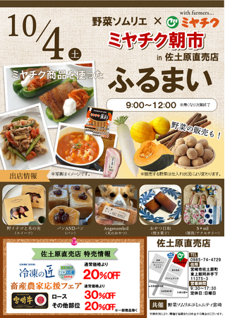 株式会社ミヤチク(本社:宮崎県都城市/代表取締役社長:船ヶ山 祐二)が運営する「宮崎牛」「宮崎ブランドポーク」「ハム・ソーセージ」を取り扱うミヤチク佐土原直売店(宮崎市)にて、10月4日(土)に、野菜ソムリエとミヤチクのコラボ企画「ミヤチク朝市」の開催が決定しました!ミヤチク商品を使ったふるまいや、新鮮野菜の販売、佐土原直売店でのお肉特売など盛りだくさん☆
