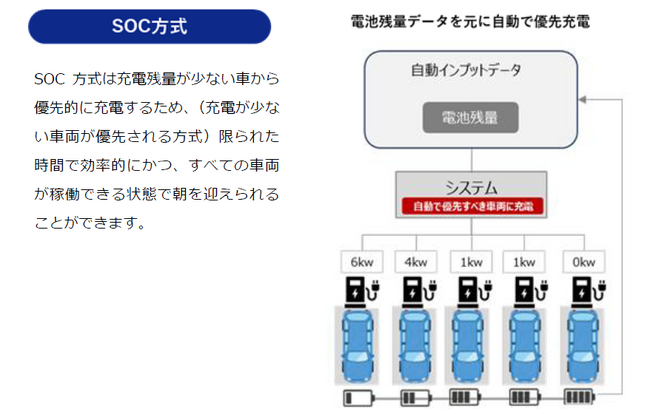 本サービスは、拠点や施設の電力消費量とEVのSOCデータを同時にモニタリングし※、一斉充電による契約電力の高騰を回避。さらにバッテリー残量が少ない車両を自動的に優先することで、複数台のEVを効率的に充電します。これにより、電気代の高騰を抑制するとともに、複雑な充電スケジュール作成・設定作業が不要になります。また、効率的な充電マネジメントにより最小限の充電インフラでの運用が可能となり、EV導入のハードルとなるイニシャルコストを削減し、企業のEVシフト促進に貢献いたします。