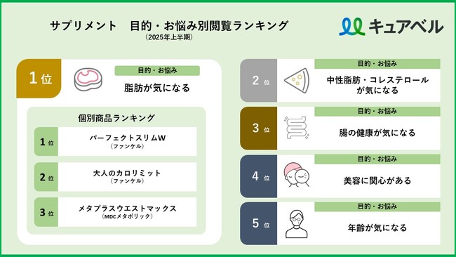 2025年度上半期の「目的・お悩み別」サプリメント人気商品TOP3を発表/「脂肪が気になる」ユーザーが最も閲覧したサプリメントは?