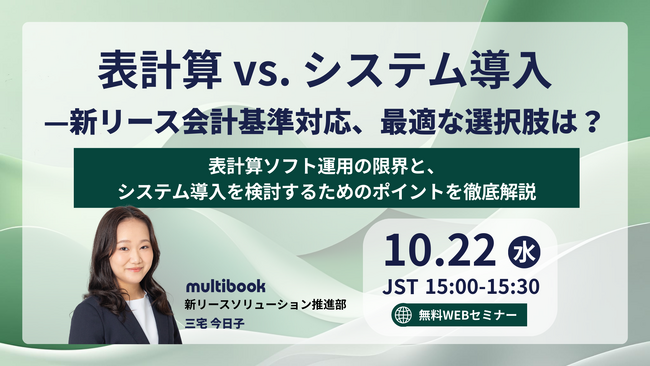 グローバルクラウドERPサービス「multibook(マルチブック)」を提供する株式会社マルチブック(東京都品川区、代表取締役社長:渡部 学)は、Webセミナー「表計算 vs. システム導入--新リース会計基準対応、最適な選択肢は? 表計算ソフト運用の限界と、システム導入を検討するためのポイントを徹底解説」を開催いたします。