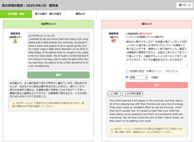 また、保育施設における外国にルーツを持つ園児数は増加傾向にあり、こども家庭庁の調査*2においても、「外国籍等の子どもや保護者の具体的な困りごとやニーズがわからない」「通訳や翻訳を行える人員が足りない」といった課題が報告されています。これらの言語面の課題に対して、AIは有効な解決策となります。今回、AIサポート機能の一つに外国語翻訳機能を搭載することは、今後ますます多文化共生が求められる時代において、保護者との円滑なコミュニケーションに有効だと考えます。