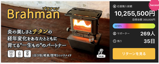 クラファン累計1.2億円突破のSorge、“所有欲を満たす”純チタン製ストーブ《Brahman》が公開3週間で1000万円到達!
