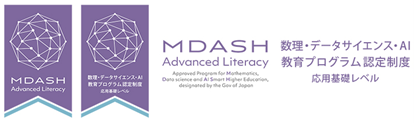 本学では、全学生が数理・データサイエンス・AIのリテラシーレベルと応用基礎レベルを学ぶ体制を整えており、令和5年度には文部科学省より「数理・データサイエンス・AI教育プログラム(リテラシーレベル)」として認定されていました。今回の「応用基礎レベル」への選定は、共通コア科目「数理・データサイエンス・AI入門」に加えて、各学科毎に以下の科目について「応用基礎レベル」の修了要件を満たすものとして認定されたものです。