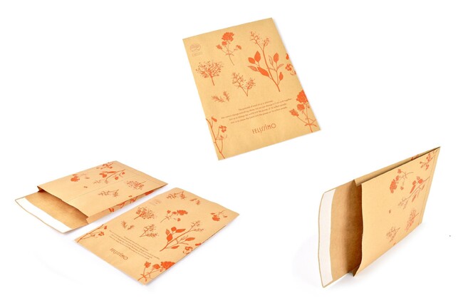 環境への配慮という私たちの想いに共感いただけるよう、あたたかみのあるクラフト紙に、ぬくもりを感じるオレンジ色のインクでデザインを施しました。商品が届く前から、フェリシモならではの“やさしさ”や“楽しさ”を感じていただけることを願っています。