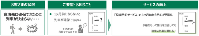 サービス1:新幹線の指定席が、これまでよりも早くお申込み可能に。乗車日の3ヶ月前から予約できる新サービスで、旅の計画がさらにスムーズになります。