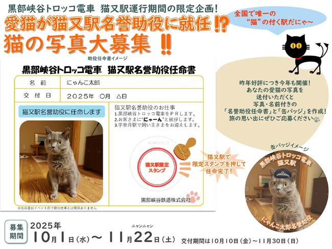 黒部峡谷鉄道株式会社(運営:黒部峡谷鉄道株式会社、所在地:富山県黒部市、代表取締役社長:鈴木 俊茂)では、昨年より、全線開通までの期間限定で工事関係者専用駅である「猫又駅」での乗降を実施しております(※)。この「猫又駅」は、日本で唯一駅名に「猫」がつく駅で、弊社ではこれを広く知っていただこうと、昨年実施し好評を得ました、猫の「名誉助役」任命企画を本年も春に引き続き秋に実施することといたしました。