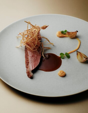 全7皿または全5皿からお選びいただける秋のコースの前菜には、旬の戻りカツオを主役に。トマトとビーツの瑞々しい色彩を重ね、目にも美しいカルパッチョに仕立て、ワイルドライスの香ばしさが、食感と香りを添え、秋を感じさせる一皿です。脂の乗った鰤は、カリっとポワレし、京都松野醤油とバルサミコビネガーで奥行きを加え、海の恵みを存分にご堪能いただけます。メインディッシュには、京都亀岡産のブランド鴨「七谷鴨」をじっくりローストし、コクある赤ワインソースとゴボウの土の香りで鴨の力強い旨味に繊細な余韻を添えました。