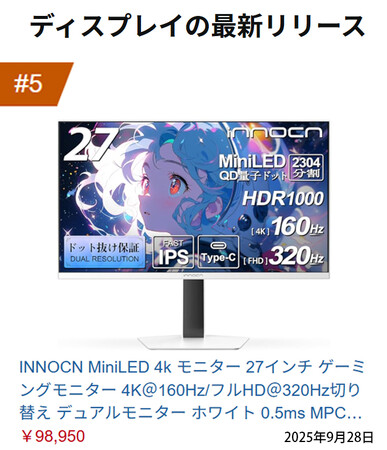 皆様からの多大なるご支持をいただき、GA27V1MはAmazonディスプレイ新着ランキング第5位にランクインいたしました。本当にありがとうございます。