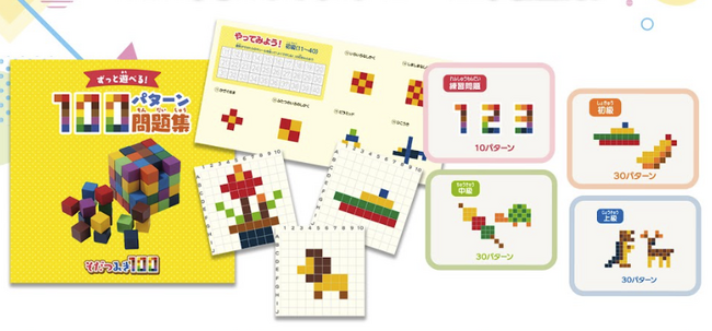 合計100ピースのカラフルな木製キューブと、動物や食べ物など子どもがワクワクする100問の図形問題を収録。「見る・考える・作る」の体験を通じ、図形感覚や観察力が自然と身につきます。