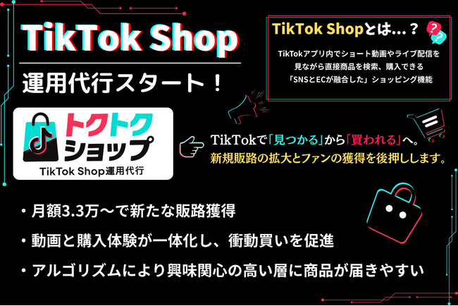 SNS運用を手がける合同会社CWB(所在地:東京都新宿区、代表:藤波拳矢)は、2025年9月より新サービス「トクトクショップ:TikTok Shop」を開始しました。本サービスは、動画による訴求力と購買導線の最適化、さらにUGC(ユーザー生成コンテンツ)を活用した拡散を組み合わせ、競争の激しいEC業界において持続的に売れる仕組みを提供します。