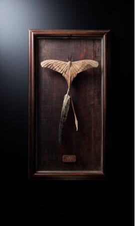 卒業制作で作成した「カラスの舟は昇華する」の作品や、アパレルブランドUNDERCOVERとのコラボレーション作品、「日本」をテーマにした時に作成した「JAPAN」の作品、大森氏の代表作である「ぬけない棘のエレファント」「ぬけない棘の狼」など棘をテーマにした作品などを、ベースモチーフとなる「蛾」に投影し、それぞれ表現した作品となります。