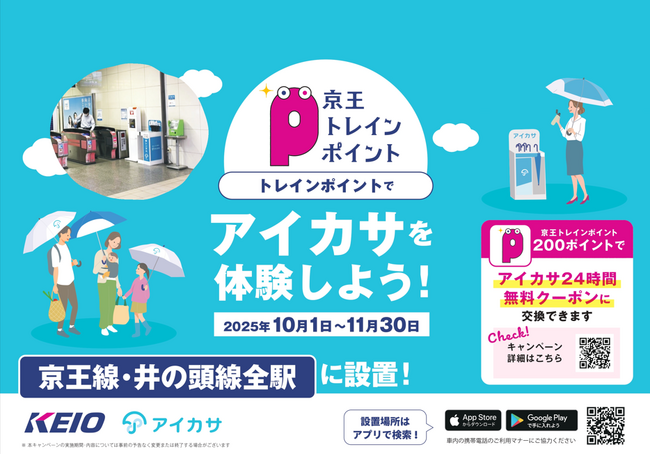 雨の日を快適にハッピーにする傘のシェアリングサービス「アイカサ」を運営する株式会社Nature Innovation Group(本社:東京都新宿区、代表取締役:丸川照司、以下「アイカサ」)は、京王電鉄株式会社(本社:東京都多摩市、代表取締役社長:都村智史、以下「京王電鉄」)と連携し、2025年10月1日(水)から11月30日(日)までの期間限定で、京王電鉄が提供する「京王トレインポイント」を「アイカサ」のクーポンと交換ができるキャンペーン(以下「本キャンペーン」)を開催いたします。
