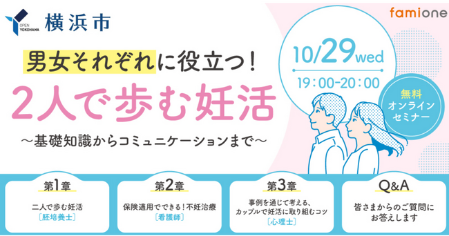 横浜市「ヨコハマ妊活SNS相談事業」の一環として、 無料オンラインセミナーを10月29日(水)19時に開催します