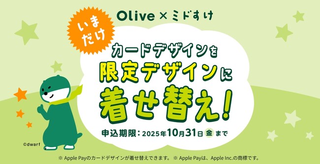 2025年10月1日より、株式会社三井住友銀行(頭取CEO:福留 朗裕、以下 「三井住友銀行」)が、【Olive×ミドすけ】Apple Payの限定カードデザインプレゼントキャンペーン!(以下、本キャンペーン)を開催いたします。