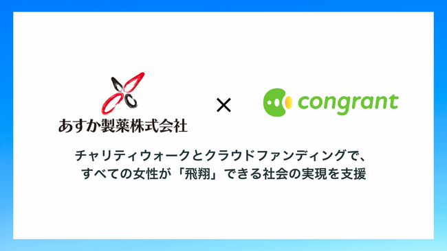 ソーシャルセクターおよび企業向けに寄付DXシステムを提供するコングラント株式会社(本社:大阪市西区、代表取締役:佐藤正隆、以下「コングラント」)は、あすか製薬株式会社(本社:東京都港区、代表取締役社長:山口 惣大)が創立20周年を記念して始動する社会貢献プロジェクト『Wings of Women』を、チャリティウォークシステムおよびクラウドファンディングプラットフォームの提供を通じて支援します。