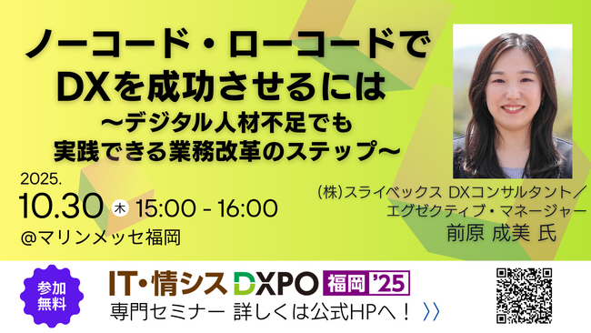 福岡にて初開催される「IT・情シスDXPO」(会期:2025年10月30・31日、場所:マリンメッセ福岡A館)に、株式会社スライベックスのDXコンサルタント 前原成美がセミナー講師として登壇。