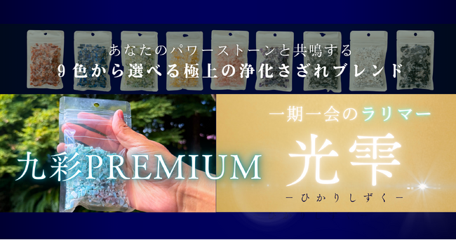 浄化用さざれ石『九彩』の販売から7カ月。フォロワー様から要望の多かった世界三大ヒーリングストーン「ラリマー」を贅沢に使い、「九彩PREMIUM -光雫-」を数量限定で販売し、40分で完売しました。