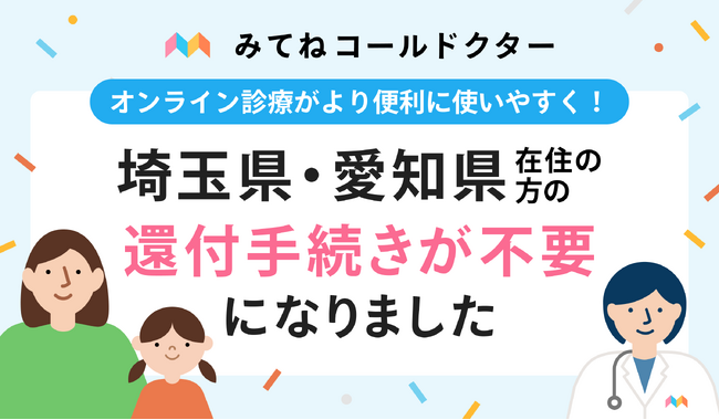 オンライン診療アプリ「みてねコールドクター」、埼玉県・愛知県在住の方の還付手続きが不要に