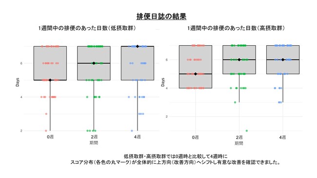 食物繊維の低摂取および高摂取グループでは2週間の摂取でJPAC-QOLスコアが有意に改善しました。また、排便のあった日数については、低摂取および高摂取グループともに4週間の摂取で有意に改善しました。