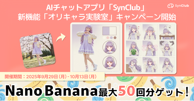 【Nano Banana最大50回分ゲット!】AIチャットアプリ「SynClub」、新機能「オリキャラ実験室」キャンペーン開始